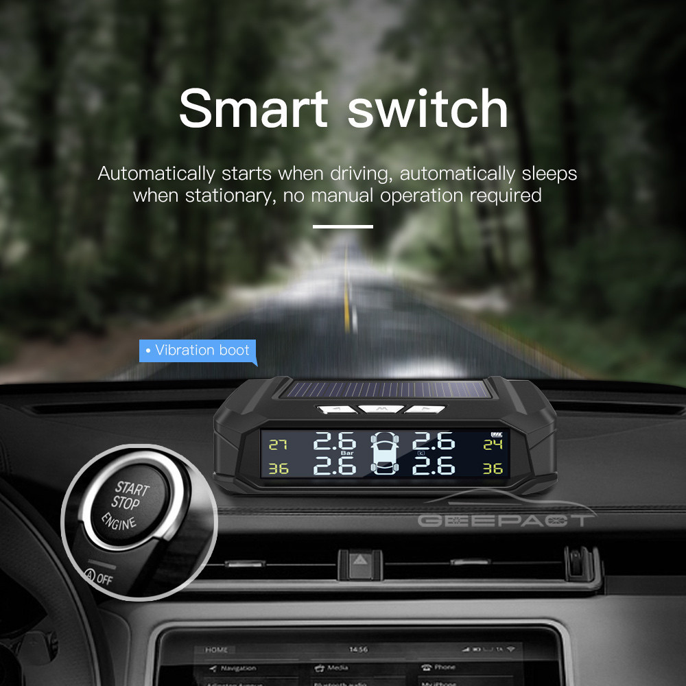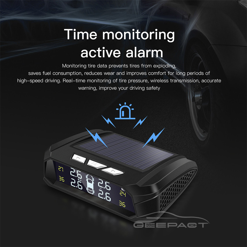 TPMS Universal Tire Pressure Alarm Monitoring System Car Tire Pressure Monitoring System Solar Panel USB Charging Smart Car with 4 External Sensors Real-time LCD Display